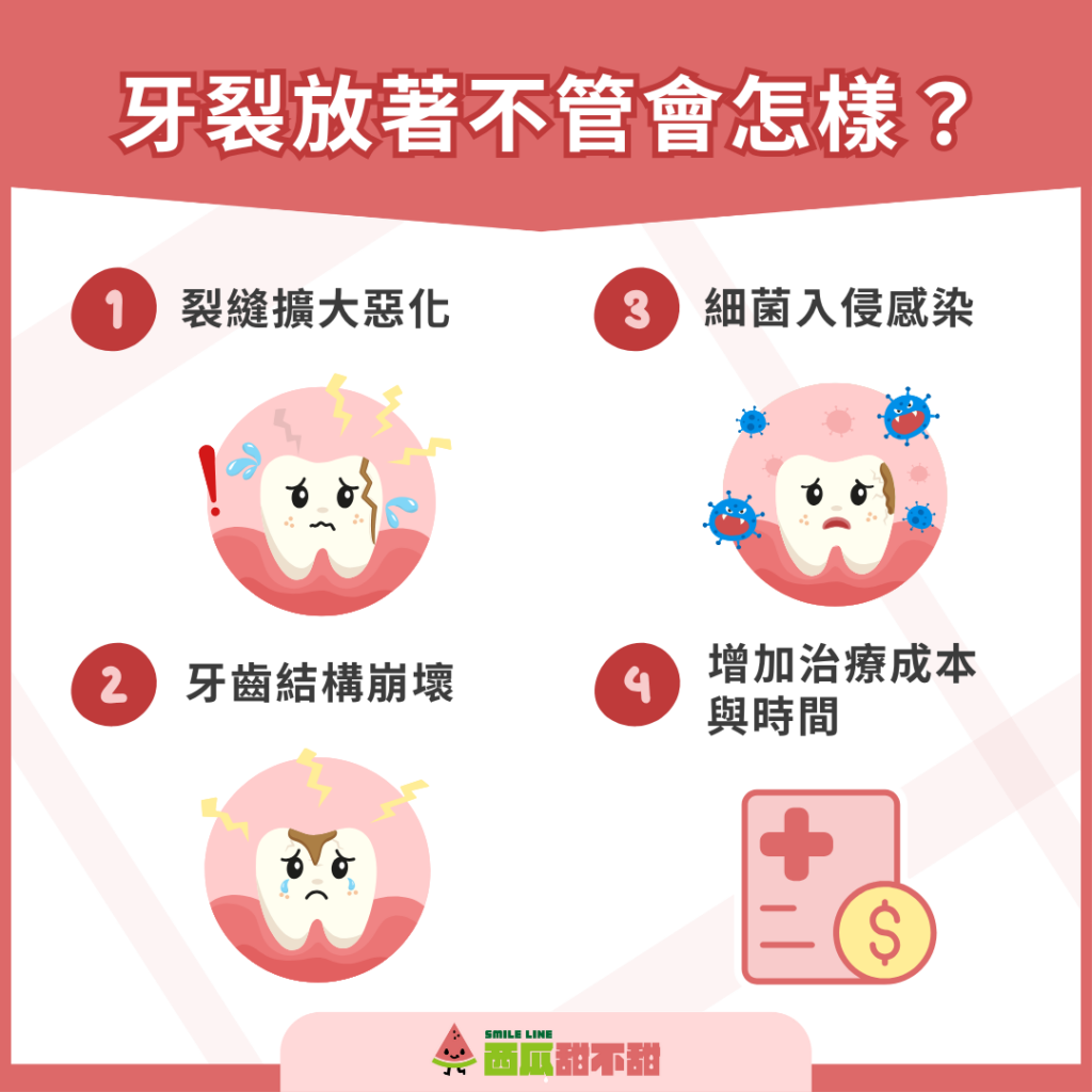 牙齒不像皮膚一樣具備自我修復能力,一旦出現裂縫就無法自行癒合。若牙裂放著不處理,可能會帶來以下幾項風險: